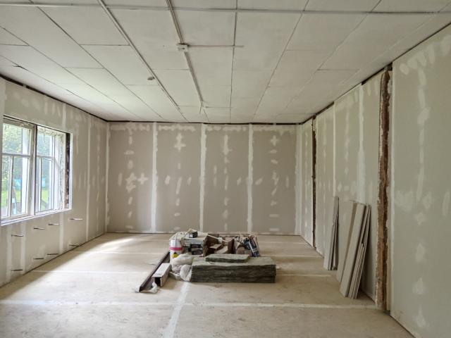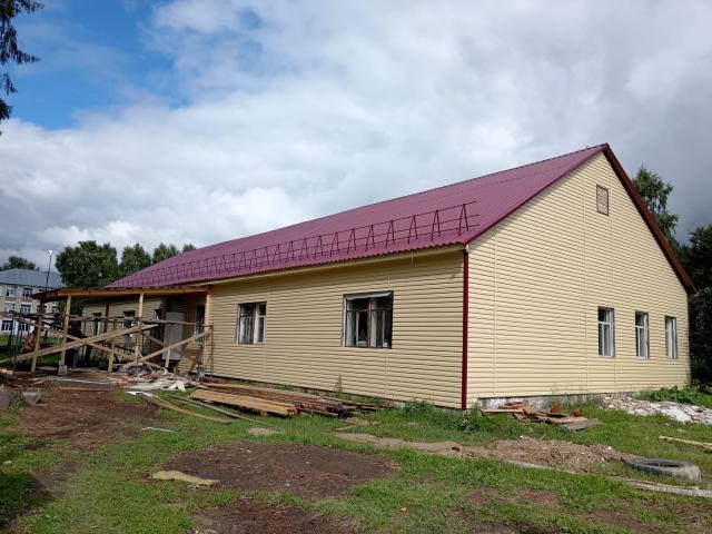 Техническая готовность объекта на начало августа составила 40 %. Подрядчик ПК «Монолит» завершает работы по ремонту кровли, фасада, фронтона, венцов, выравниванию полов и обшивке стен гипсокартоном. Выполнены утепление и внешняя обшивка стен, смонтирован навес над крыльцом.