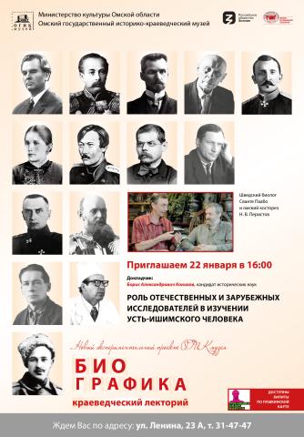 22 января в 16.00 в Омском государственном историко-краеведческом музее (ул.Ленина,23А) состоится лекция из цикла «Биографика» – «Роль отечественных и зарубежных исследователей в изучении усть-ишимского человека».