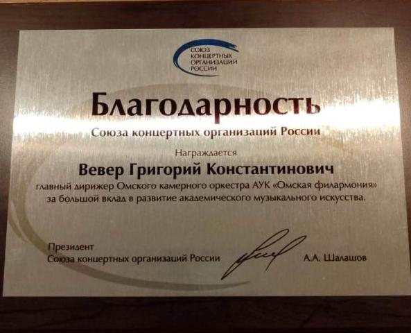 – Считаю, что это не моя персональная награда, а достижение всего коллектива Омского камерного оркестра. За последние годы оркестр сделал большой шаг в развитии. Для нас важно, что наш труд заметили и оценили на уровне страны. Это очень приятно и мотивирует на дальнейшие свершения, – отметил Григорий Вевер.