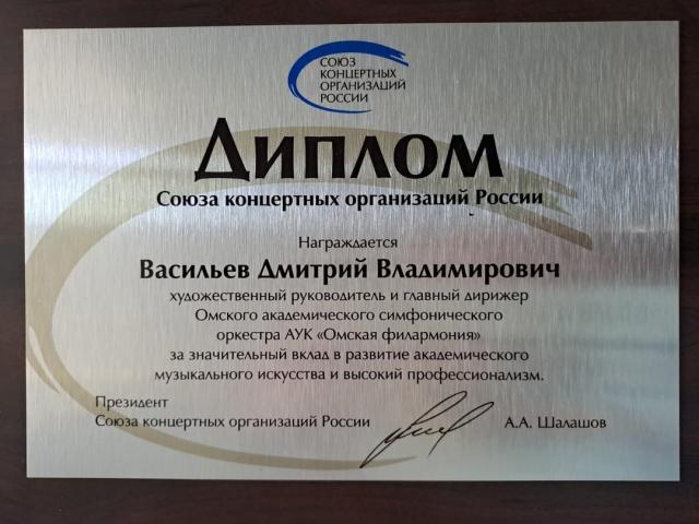 Маэстро Дмитрий Васильев награжден Дипломом за значительный вклад в развитие академического музыкального искусства и высокий профессионализм. Диплом Союза концертных организаций России (СКОР) маэстро получил заочно.