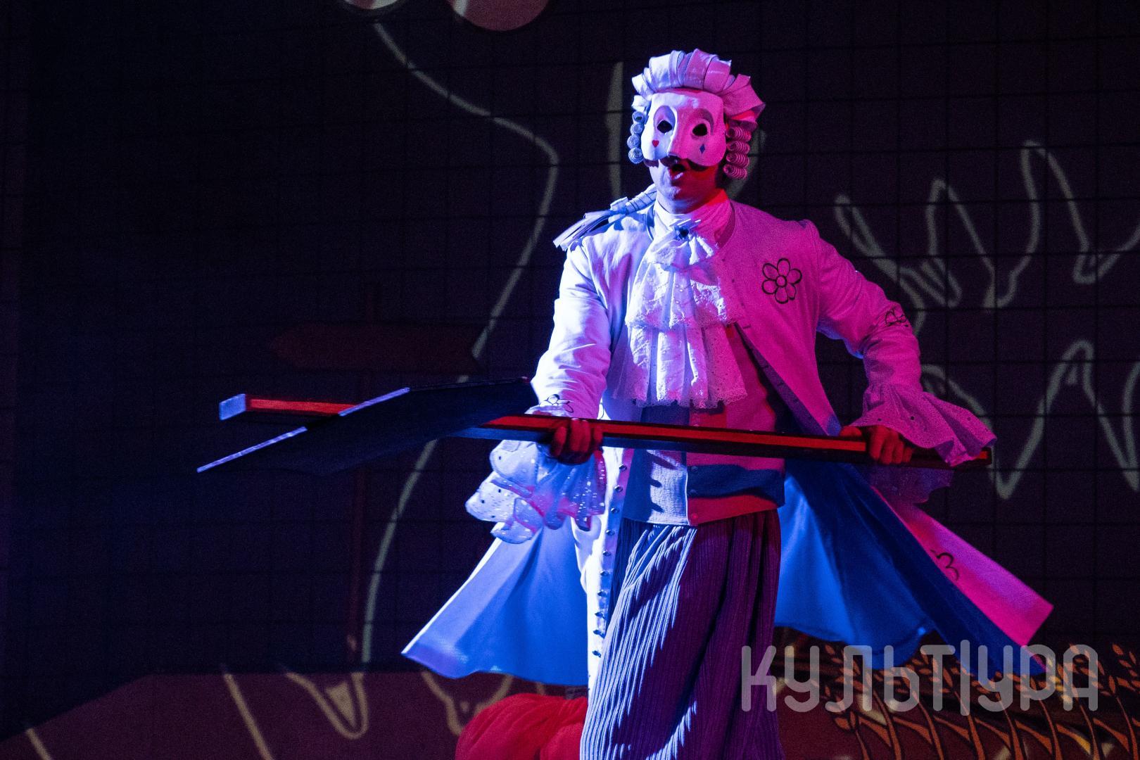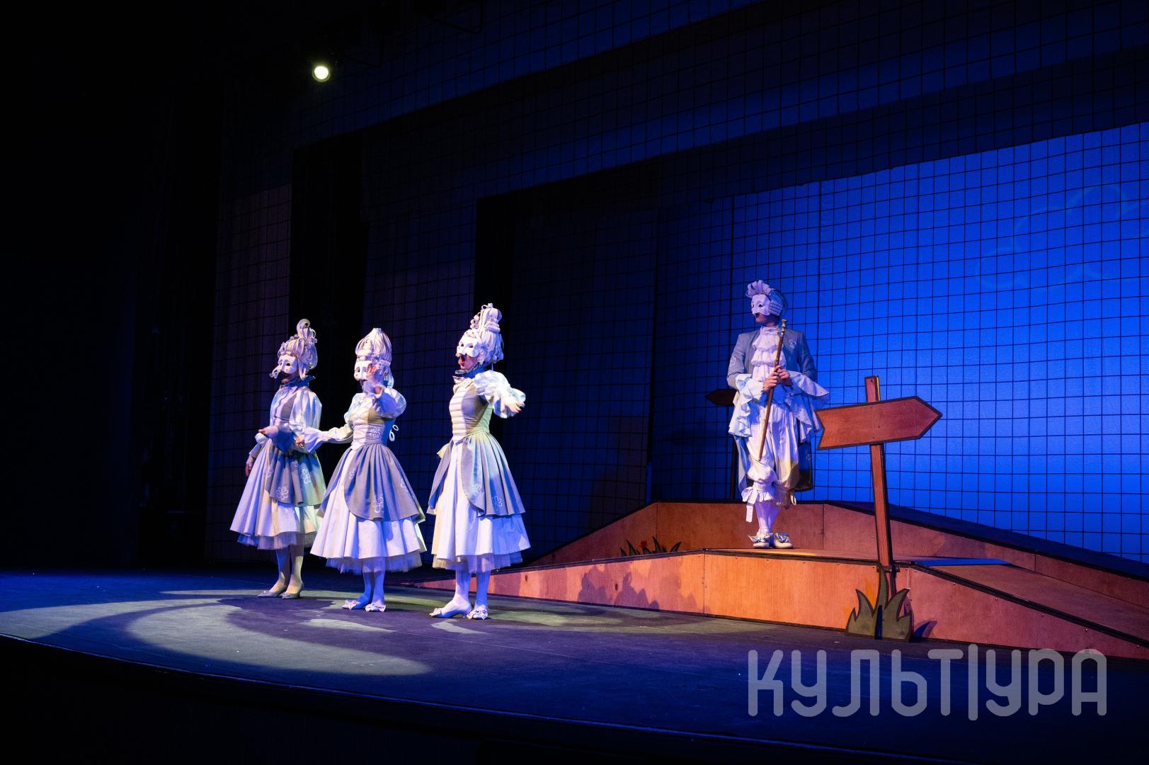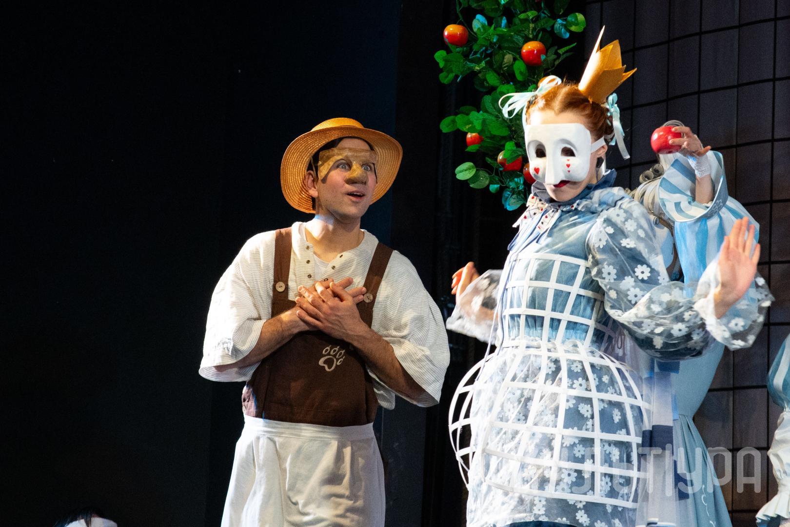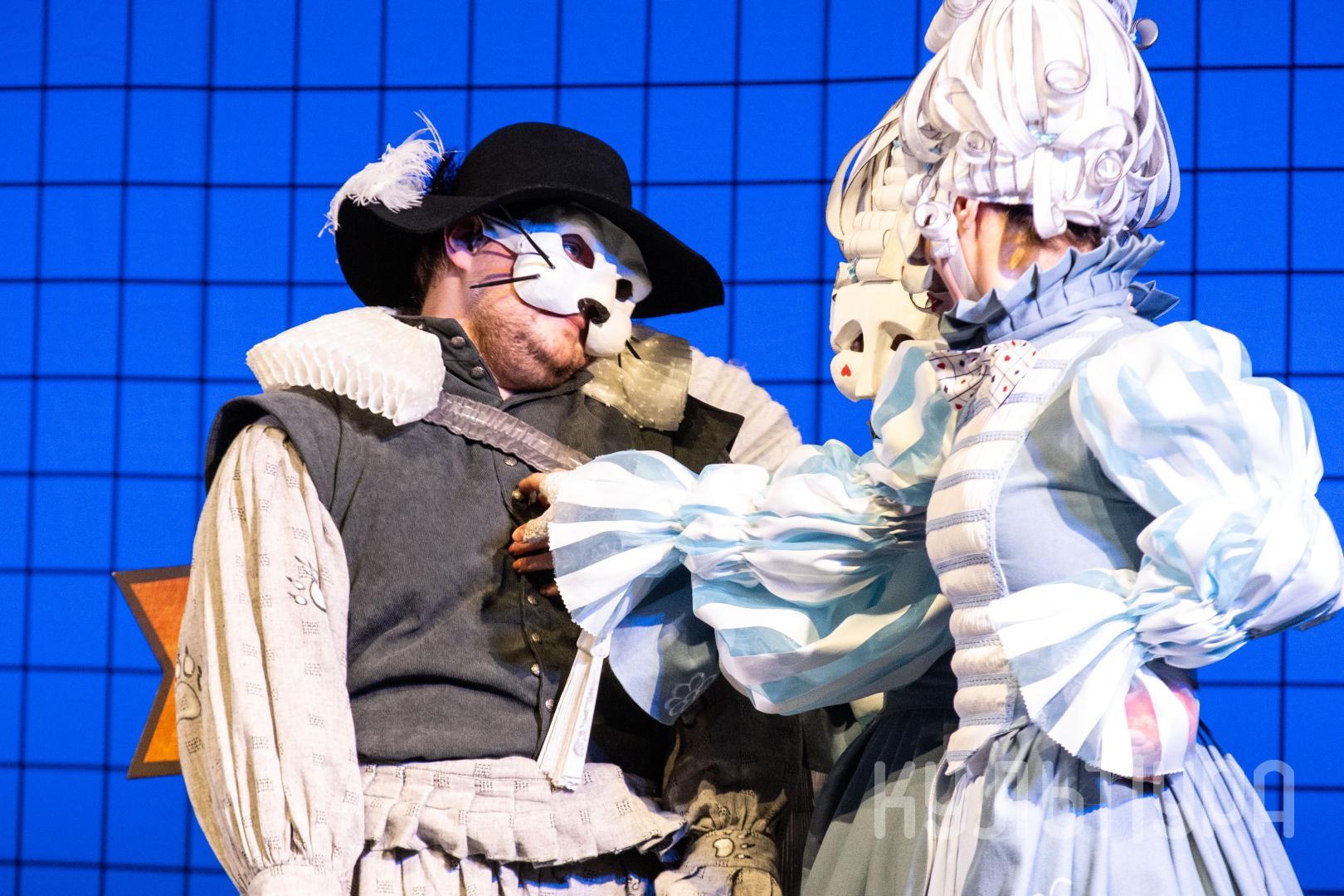 Главный герой сказки — Кот в сапогах. В исполнении Егора Лябакина он чрезвычайно обаятельный, ловкий и общительный. Принцесса, король, придворные, братья Стефана, фрейлины – всех их объединяют... венецианские маски на лицах. Придуманный создателями спектакля ход придает знакомому сюжету особую магию и удваивает его сказочность. Лица артистов зрители увидят только на поклонах, после окончания спектакля. На протяжении всего действия ни один из персонажей не покажет своего лика. Даже деревья, крестьяне и ветер-ураган останутся отчасти таинственными.