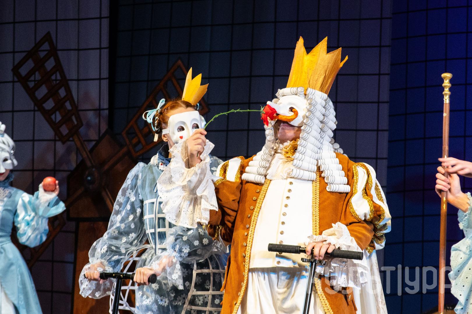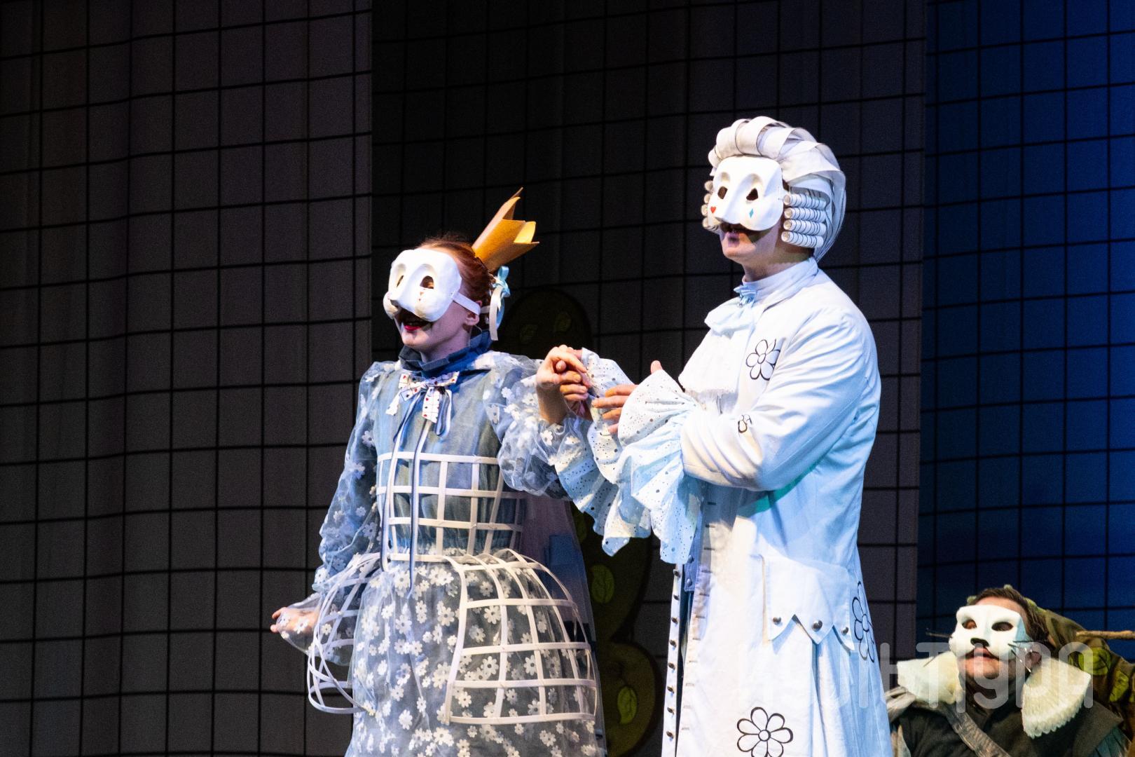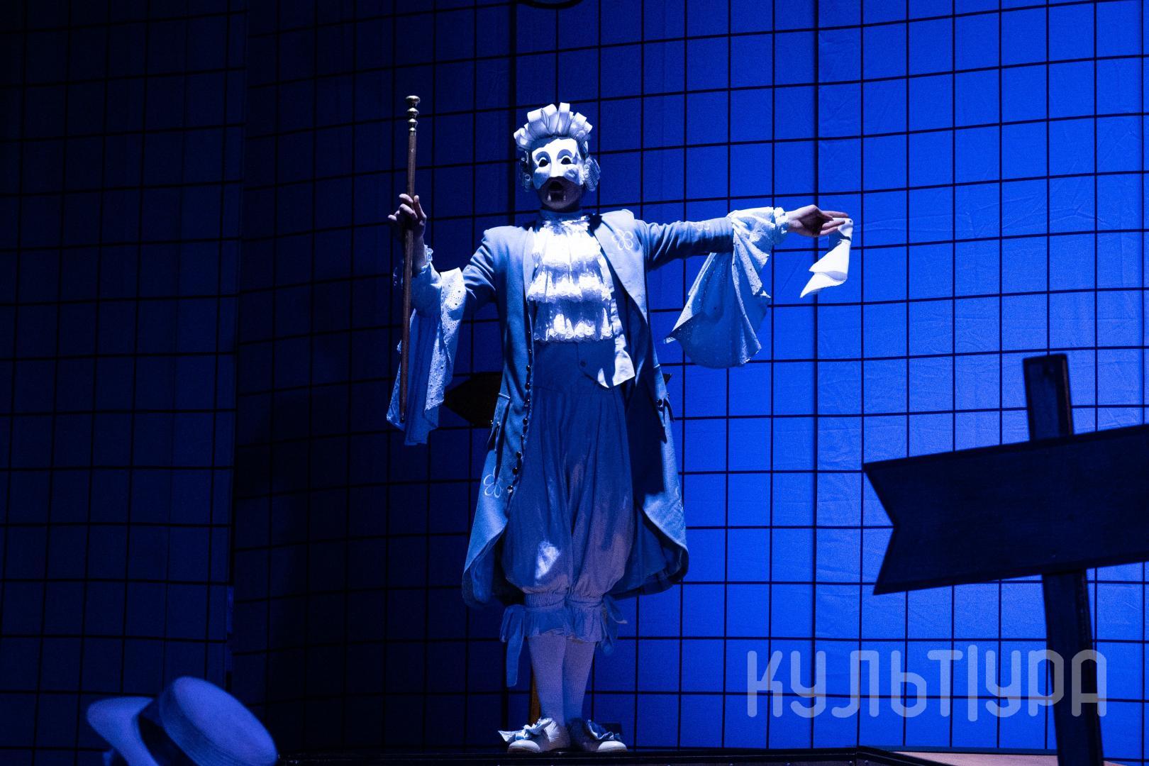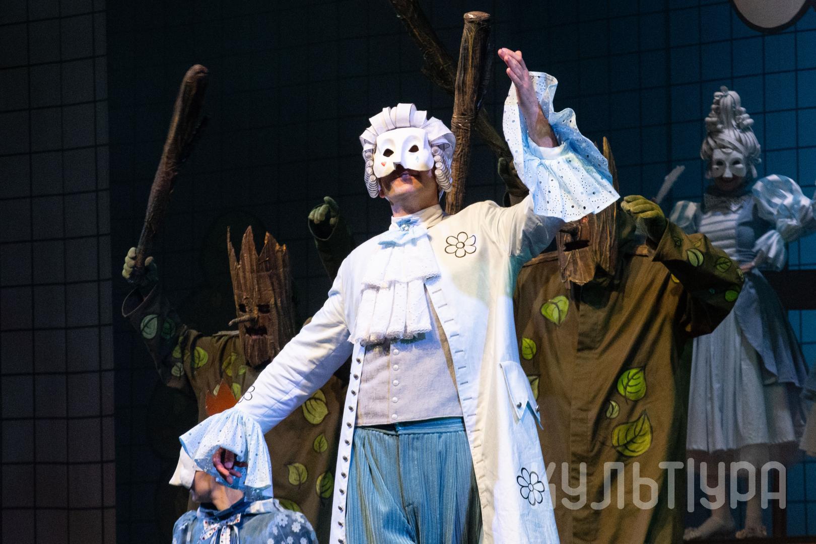 Главный герой сказки — Кот в сапогах. В исполнении Егора Лябакина он чрезвычайно обаятельный, ловкий и общительный. Принцесса, король, придворные, братья Стефана, фрейлины – всех их объединяют... венецианские маски на лицах. Придуманный создателями спектакля ход придает знакомому сюжету особую магию и удваивает его сказочность. Лица артистов зрители увидят только на поклонах, после окончания спектакля. На протяжении всего действия ни один из персонажей не покажет своего лика. Даже деревья, крестьяне и ветер-ураган останутся отчасти таинственными.