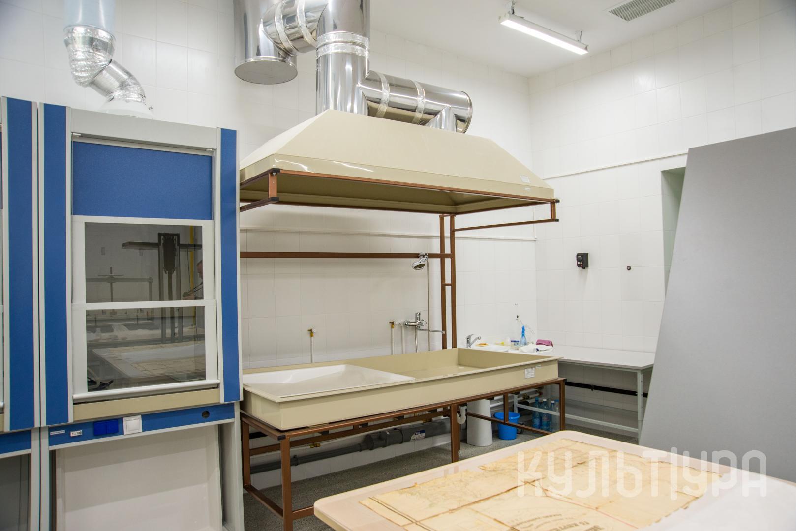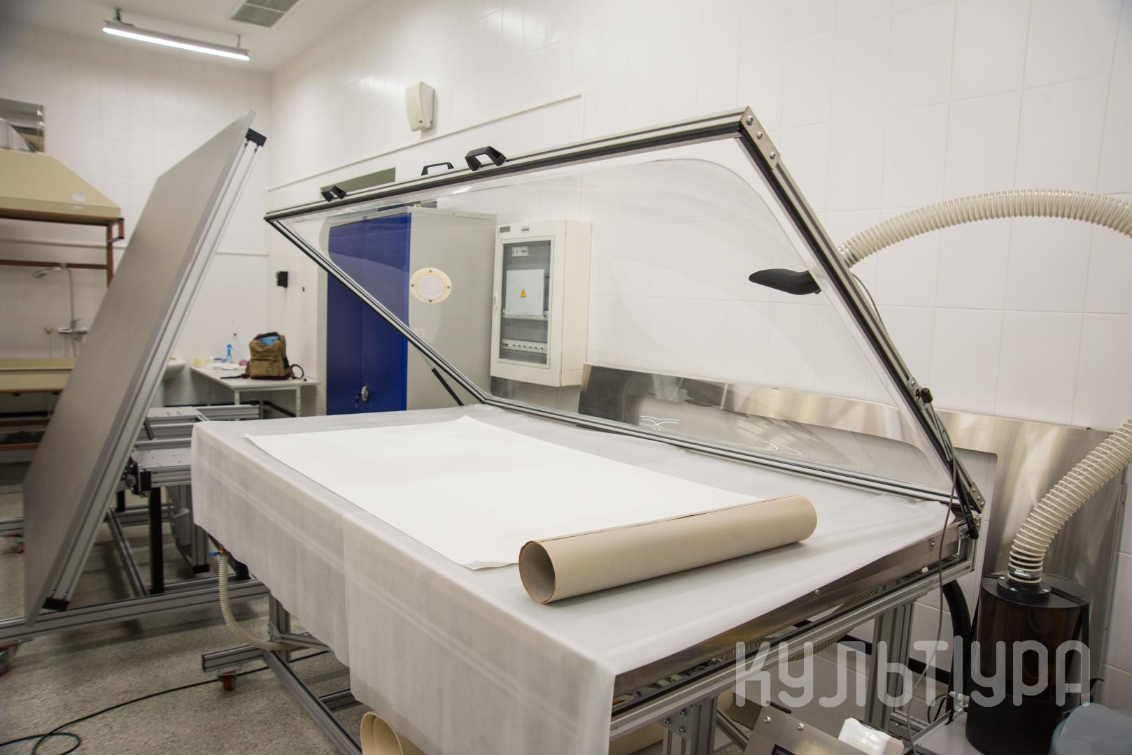 Вакуумный стол, изобретенный еще в советское время ленинградскими реставраторами, был в дальнейшем доработан и усовершенствован. Стол для омского музея изготовлен по специальному заказу и предназначен для реставрации крупноформатных музейных предметов графики, документов (например, карт), живописи и ткани. На сегодняшний момент вакуумного стола такого размера в других городах Сибири нет.