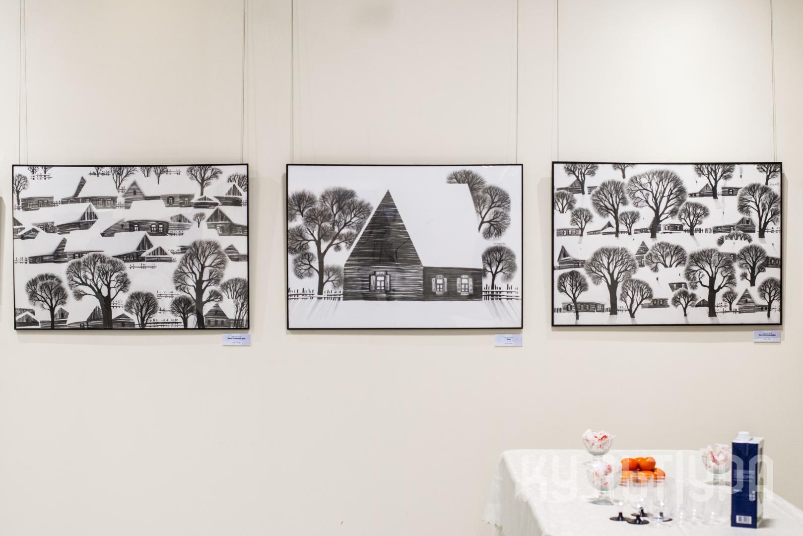 Черно-белые композиции триптиха «Зима. Солнечный день» Анастасии Гуровой словно ослепляют белизной чистого света в яркий солнечный день. Пространство композиции достигает необъятных размеров благодаря объединению планов плоскостью, белизной листа. Вместе с этим, внимание рисовальщика сосредоточено на штудировании предметной среды, проработке деталей. Все элементы изображения – линия, штрих, точка, пятно, организуясь различным образом, наполняют пространственные композиции содержанием, жизненностью.