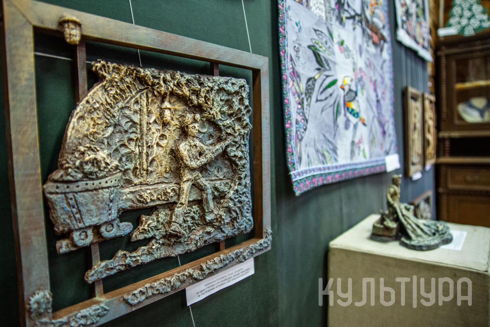 В экспозиции представлены изделия декоративно-прикладного творчества в различных техниках: керамика, батик, резьба по дереву, ковроткачество, роспись по дереву, вышивка, народный костюм и др.