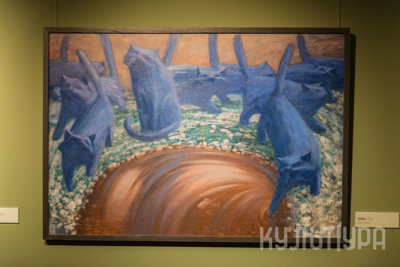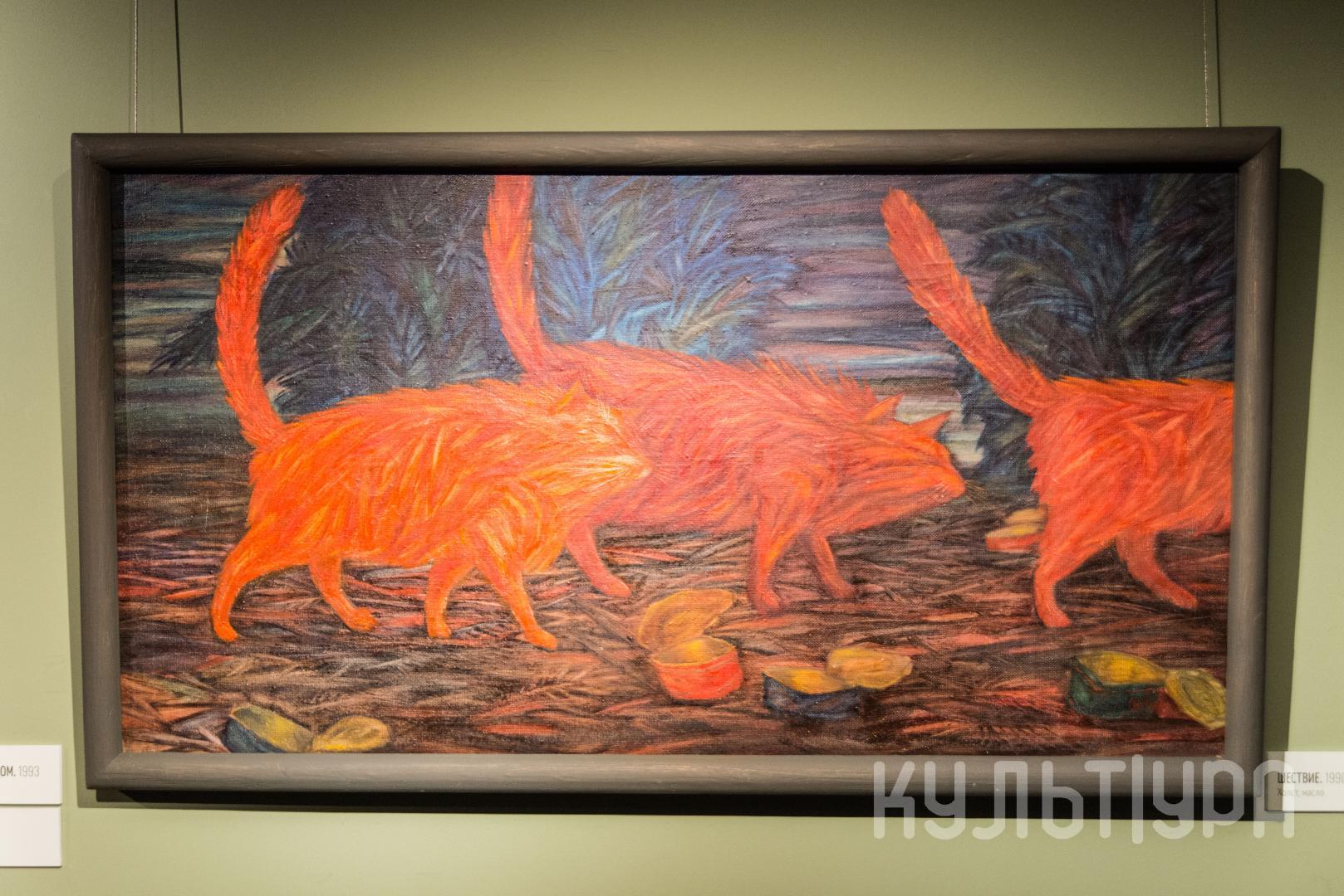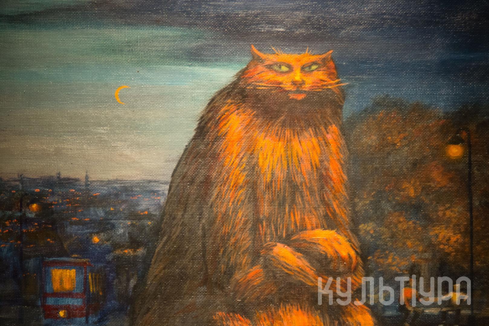 Игорь Левченко – живописец, член Союза художников России. Стиль, которому Левченко остается верен начиная с 1990-х годов, можно определить как магический реализм: художник создает фантастические миры, черпая вдохновение в окружающей реальности. Его миры двоичны, это всегда либо навь, либо явь: мрачноватая сказка или чистая беспримерная идиллия. Впрочем, Левченко нашел персонажа, который с легкостью перемещается между этими мирами и является своеобразным альтер эго художника, и этот персонаж – кот. Кот, непохожий на кавайных домашних питомцев, заселивших сегодня Интернет, это более древнее, своевольное и немного мистическое животное. Кот у Левченко одновременно трикстер – путешественник между крайностями (страшным и прекрасным, домом и улицей, телесным и духовным) и ироническая метафора двойственной природы человека (который тоже обладает как дикой/животной, так и одомашненной/культурной ипостасями).