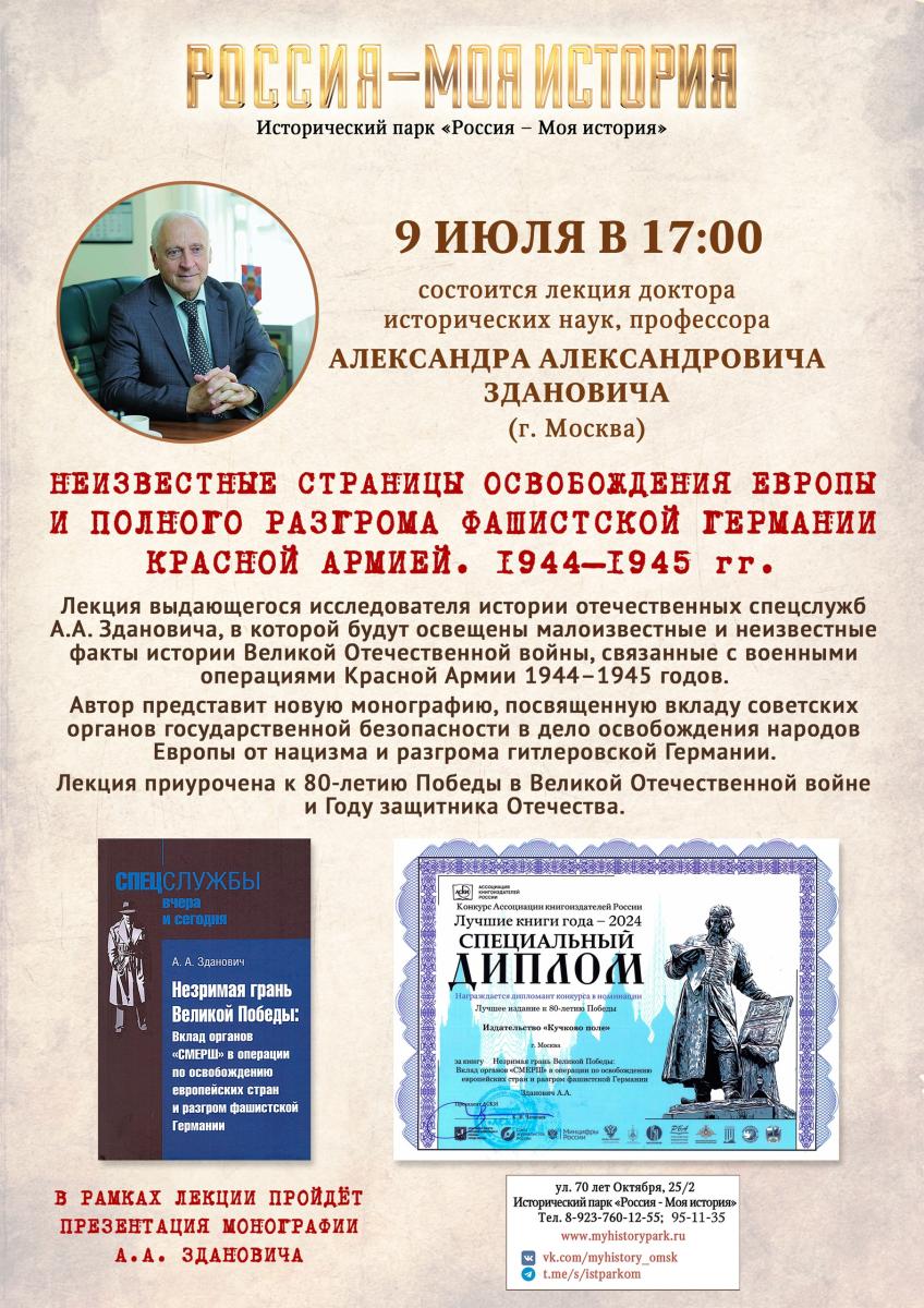 9 июля в 17:00 состоится лекция выдающегося исследователя истории отечественных спецслужб Александра Здановича, в которой будут освещены малоизвестные и неизвестные факты истории Великой Отечественной войны, связанные с военными операциями Красной Армии 1944–1945 гг.