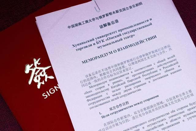 Подписан официальный документ - Меморандум о взаимодействии между Хунаньским университетом промышленности и торговли и Омским государственным музыкальным театром. Свои подписи поставили директор Омского музыкального театра Нэлли Бут и уполномоченный председатель от Университета промышленности и торговли проректор, заместитель секретаря парткома университета Сяо Сяоцинь.