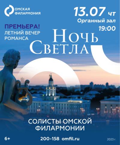 «Ночь светла» – это летний вечер романса. В новом концерте примут участие  Татьяна Харечко (сопрано), Яна Егиазарян (меццо-сопрано),  Олег Митраков (баритон) и Владимир Симонов (фортепиано). Со сцены прозвучат романсы разных эпох. Меломаны услышат произведения М. Глинки, П. Чайковского, С. Рахманинова, И. Дунаевского, А. Петрова и других композиторов.