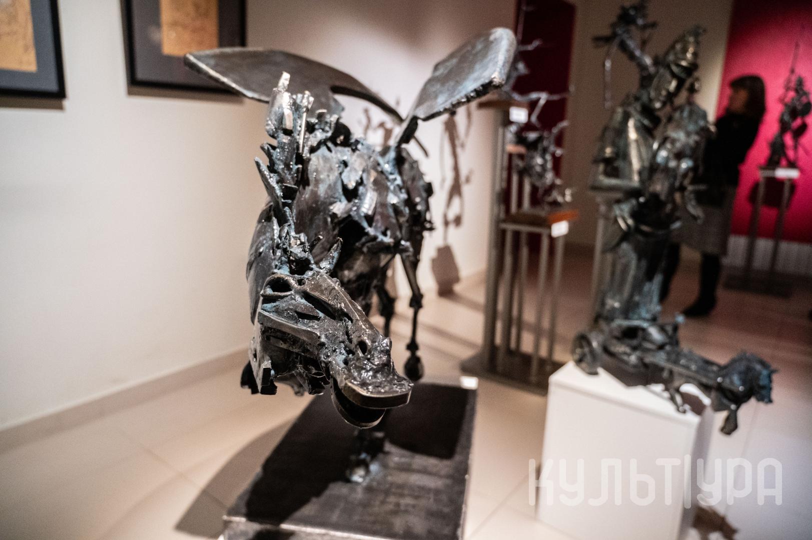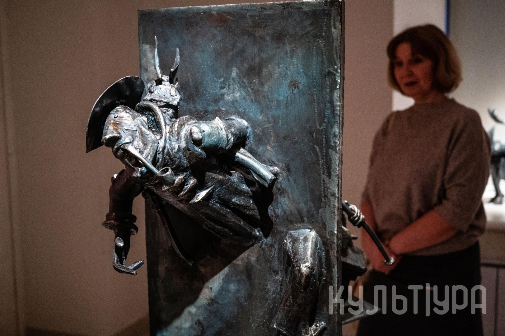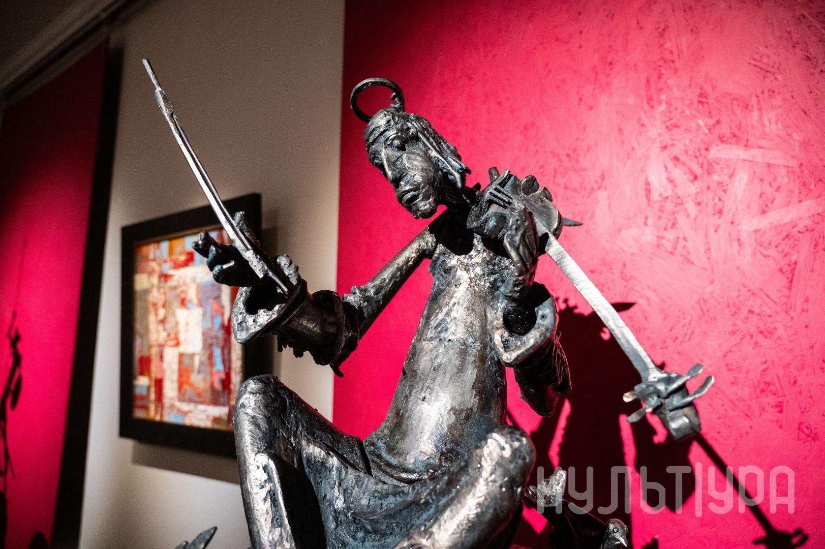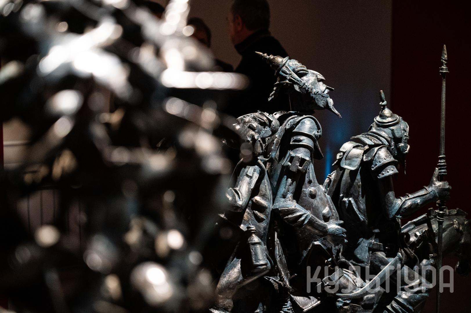 Весь первый этаж выставки METAЛLIFE организаторы превратили в разновременное пространство, в котором сочетаются античные и библейские сюжеты, европейское средневековье и кочевая Азия. Скульптуры из серии малой пластики невелики по размеру – достигают максимум 40 см, но монументальные произведения – высотой до 4 метров - поражают своим величием. Каждая из работ имеет свое настроение, стиль исполнения и чем-то напоминает карнавал ваяний из металла в образах шутов, королей, рыцарей, музыкантов, странников.
