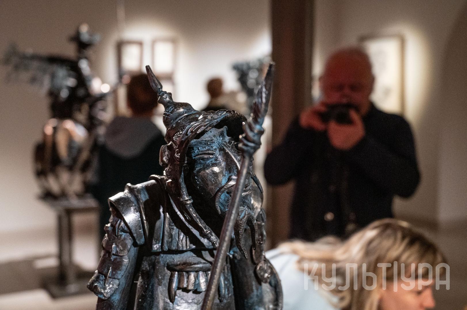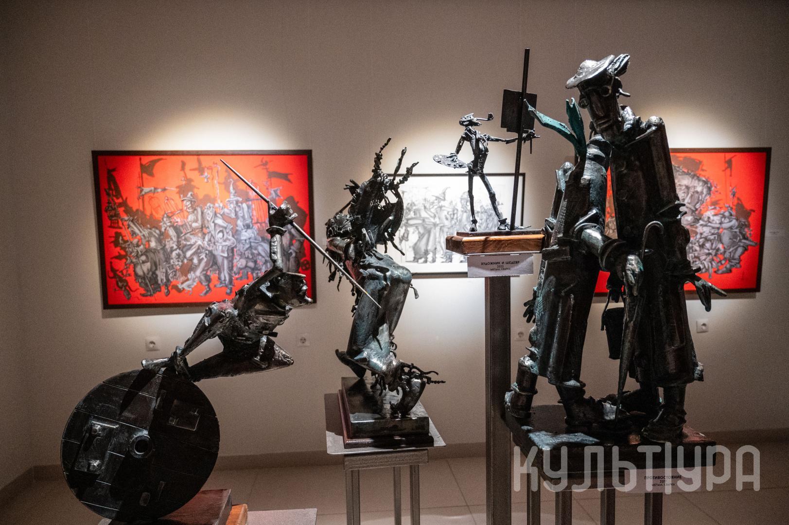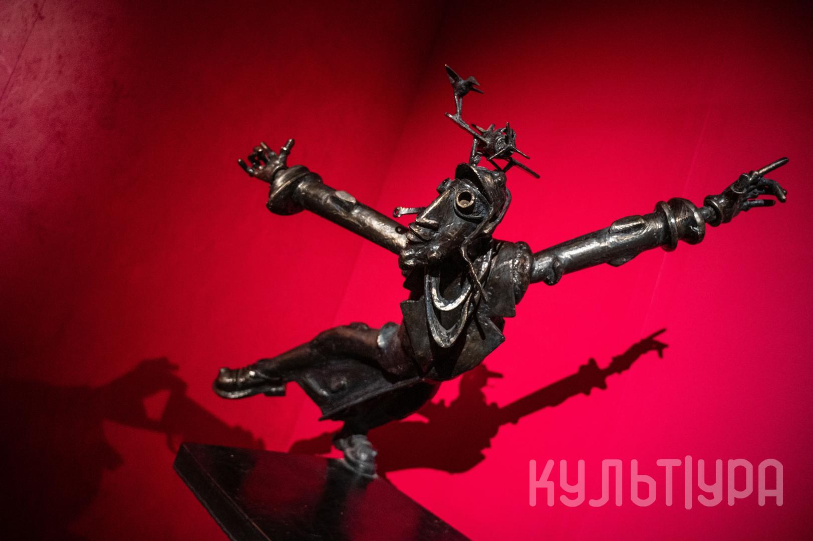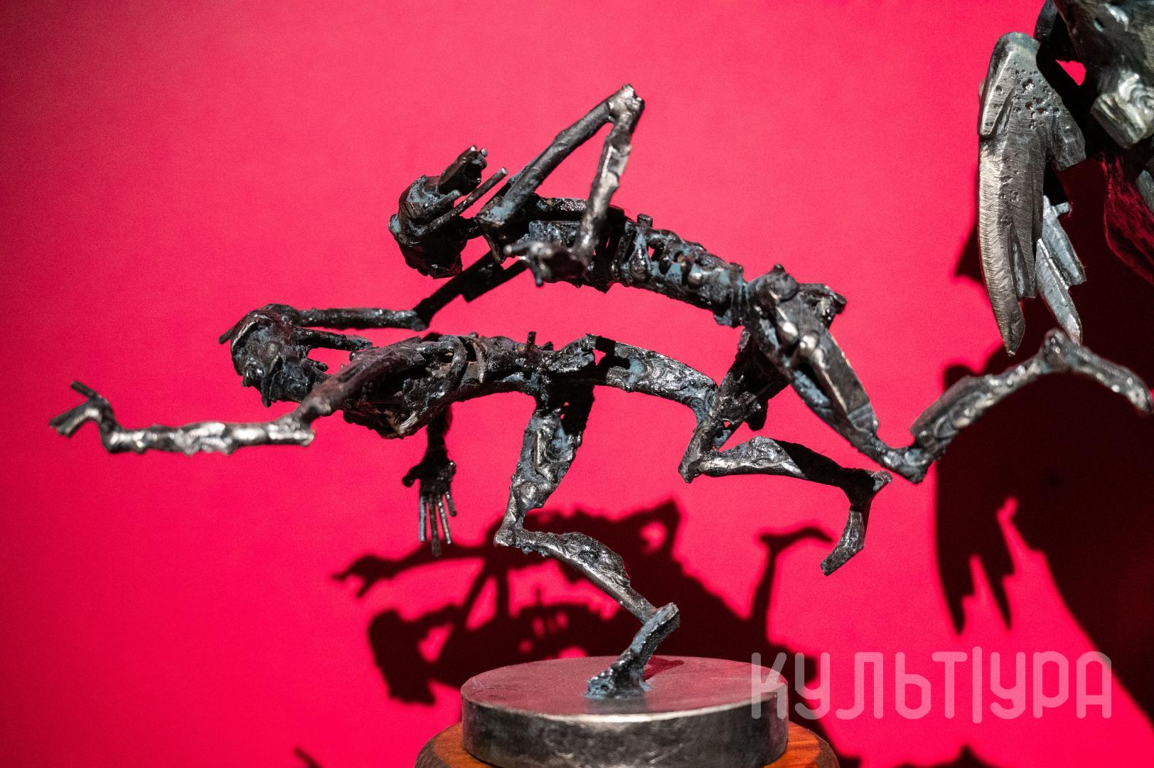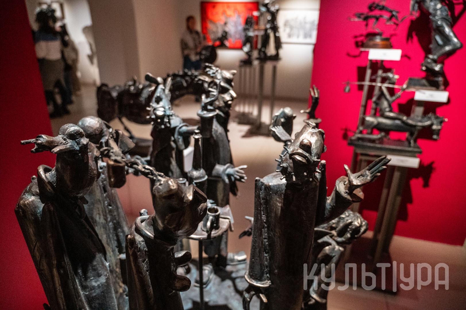Весь первый этаж выставки METAЛLIFE организаторы превратили в разновременное пространство, в котором сочетаются античные и библейские сюжеты, европейское средневековье и кочевая Азия. Скульптуры из серии малой пластики невелики по размеру – достигают максимум 40 см, но монументальные произведения – высотой до 4 метров - поражают своим величием. Каждая из работ имеет свое настроение, стиль исполнения и чем-то напоминает карнавал ваяний из металла в образах шутов, королей, рыцарей, музыкантов, странников.