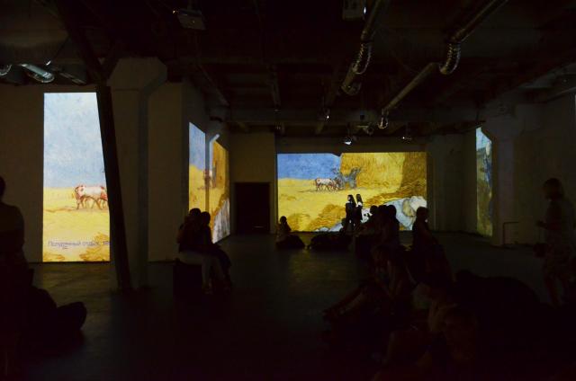 Выставка получилась медитативной. Темный просторный зал, на стенах – движутся картины виновника торжества, звучит музыка, периодически картины сменяются черными полотнами с цитатами самого Ван Гога. Звучит приятный голос диктора, ненавязчиво рассказывающий самые важные акценты биографии художника. Цитаты также читаются диктором вслух. В раннем существовании проекта озвучки не было, её было решено добавить потом.