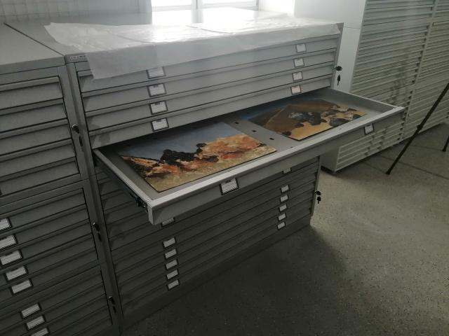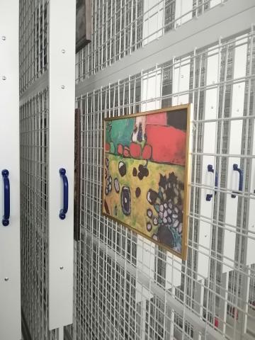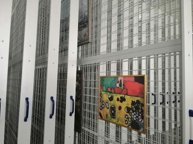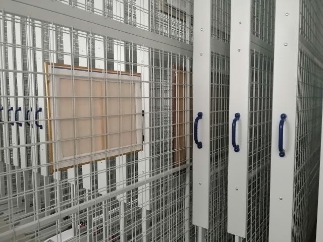 Система хранения в фонде живописи включает в себя металлические стеллажи-драйверы, предназначенные для хранения работ без подрамников (в т.ч. этюдов и эскизов к работам из собрания музея), шкафы для фондовой документации (картотек, научных паспортов, различных актов и топографических описей), и основное место занимают металлические выдвижные стойки и настенные сетки. В разработке конструкции и монтаже выдвижных сетчатых полотен принимали участие сотрудники музея, благодаря чему объем пространства будет использован максимально эффективно для компактного размещения картин (высота потолков здания позволила увеличить площадь сетчатых полотен). Новая система хранения дает возможность рационально разместить живописные произведения, быстро просматривать коллекцию и находить нужную работу.