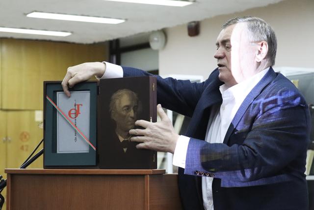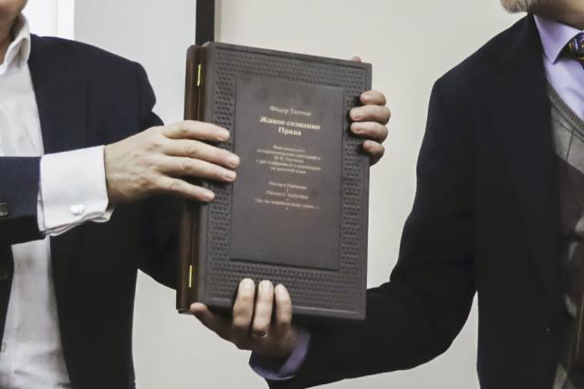 В конце презентации слушателей ждал сюрприз: Аркадий Елфимов и Святослав Капустин подарили Омску 3 экземпляра уникального издания рукописей Ф.И. Тютчева из фондов отдела рукописей РГБ «Фёдор Тютчев. Живое сознание права: факсимильное воспроизведение автографов Ф. И. Тютчева». Теперь они будут доступны читателям Омской Пушкинки, Омских муниципальных библиотек, а также посетителям Литературного музея имени Ф. М. Достоевского.